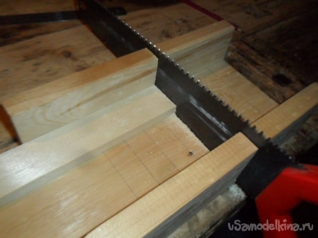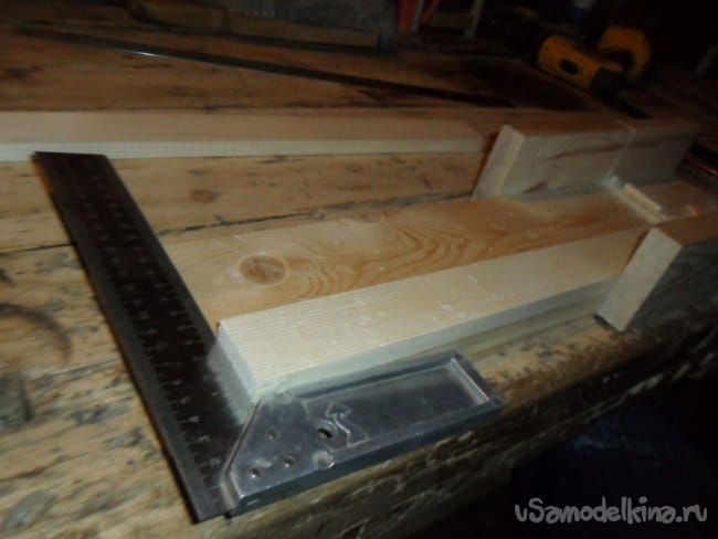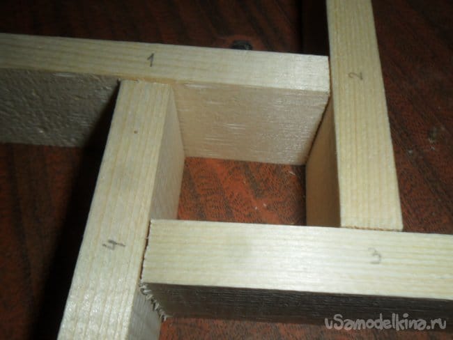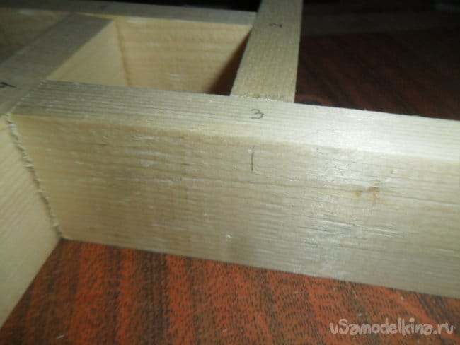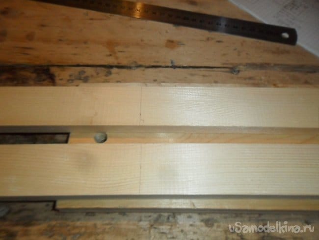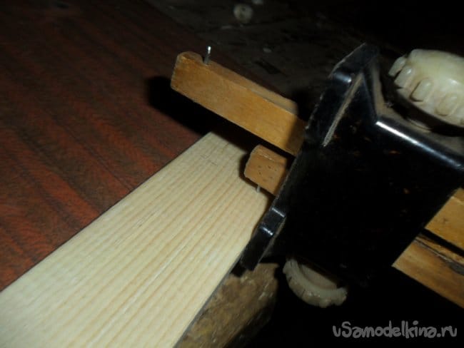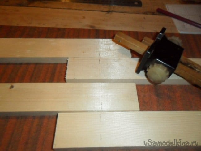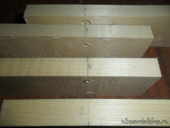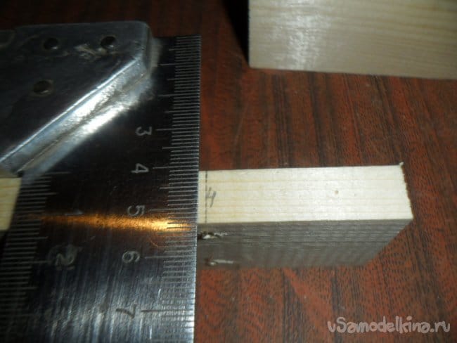 Для начала приставляем заготовки друг к другу и обозначаем их цифрами. Квадратное отверстие должно получиться со стороной 4 см. Помечаем линиями, где будут располагаться саморезы. Далее: прокалываем дерево рейсмусом с выставленной штангой на расстоянии иглы в 8 мм от колодки.