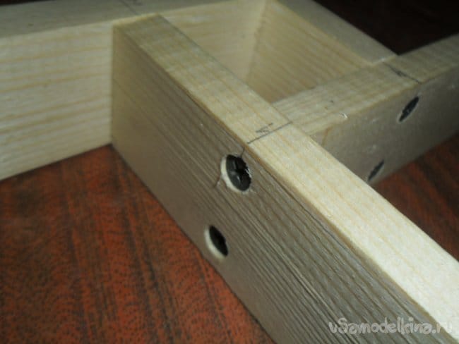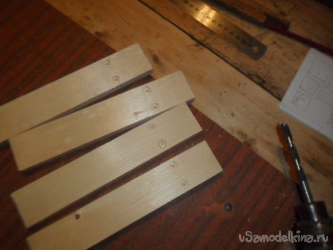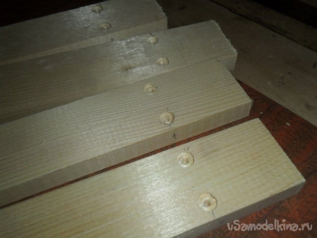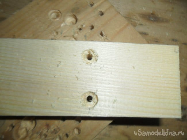 Отмеченные рейсмусом места сначала надсверливаем сверлом (8 мм), затем просверливаем рейки насквозь сверлом с диаметром 3 мм.