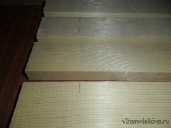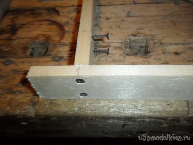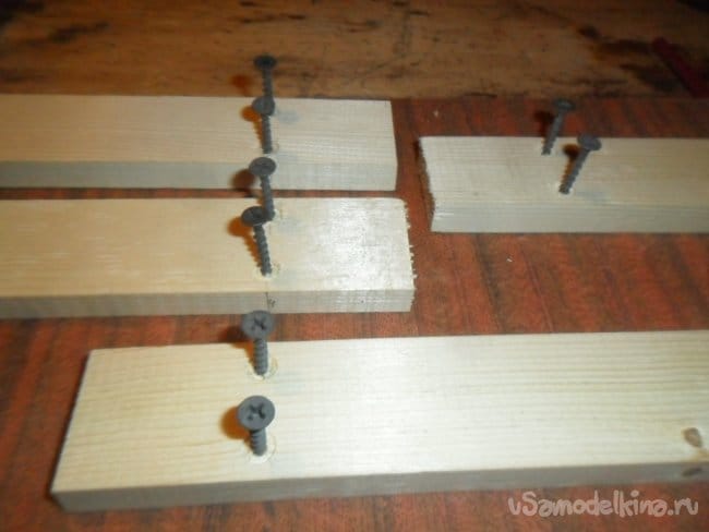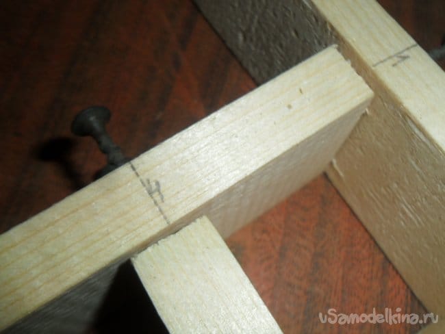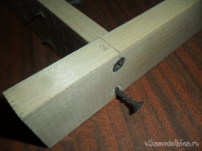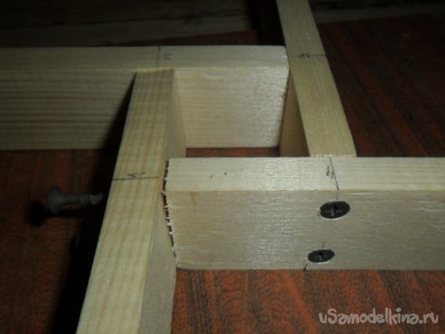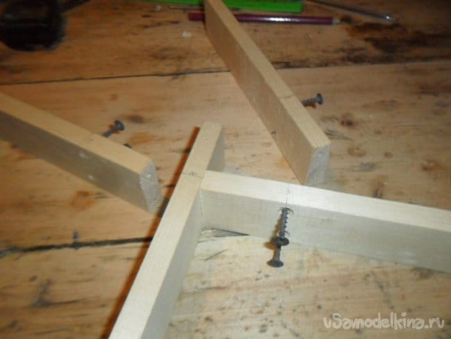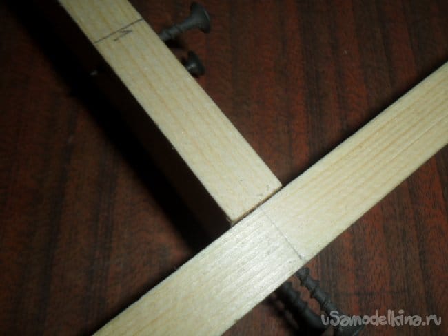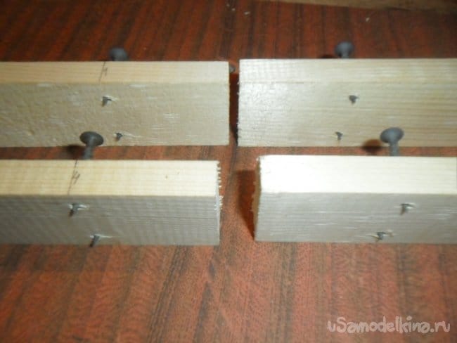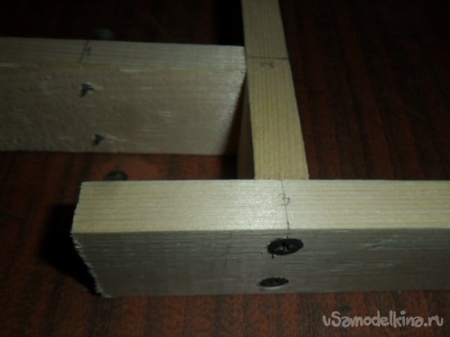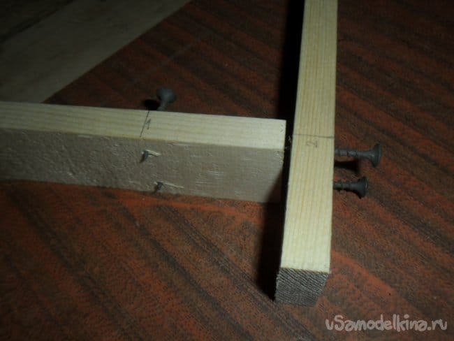 На расстоянии 4,5 см от внутренних торцов брусков сверху проводим карандашом линии, чтобы было отчетливо видно, как располагать заготовки при соединении. Затем вкручиваем саморезы до того момента, когда их острые концы выступят на 3 мм. После этого берем два бруска и приставляем их, плотно прижимая, друг к другу. Саморезы сделали свое дело – наметили места для дальнейшего вкручивания.