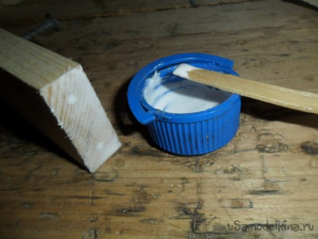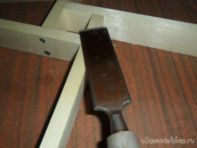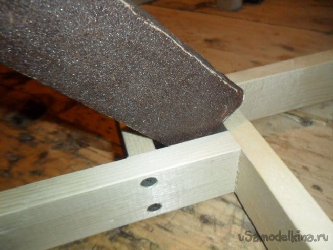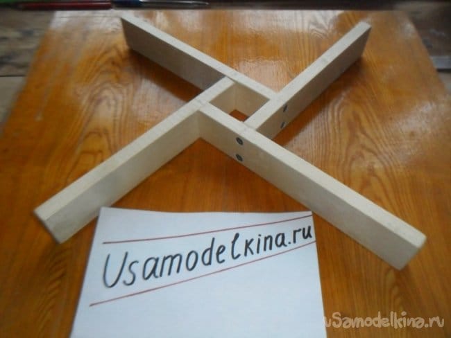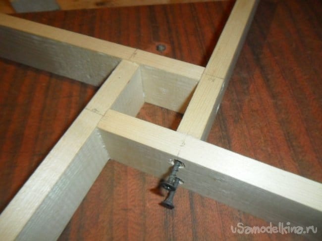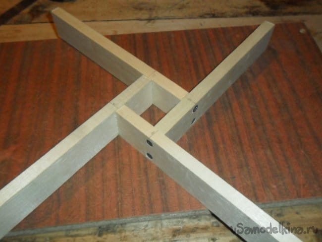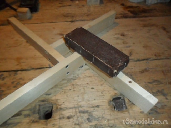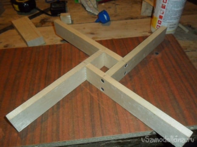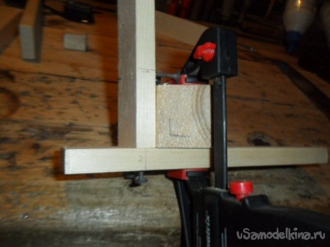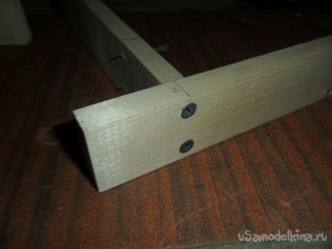 Разобрав подставку, промазываем столярным клеем торцы брусков и заново закручиваем саморезы.