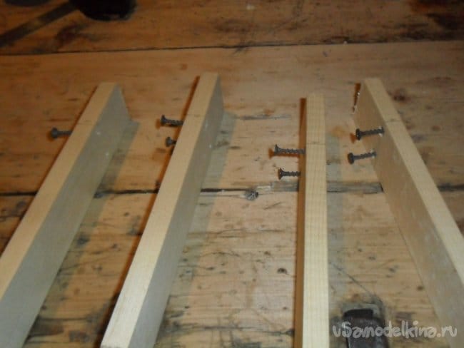 Шуруповертом закручиваем саморезы до конца. Проделываем ту же операцию с остальными рейками. Подставка готова, но не будет лишним смазать соединения клеем.