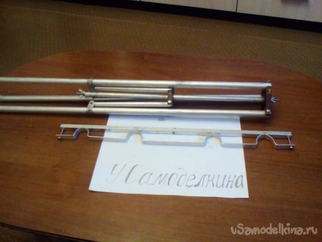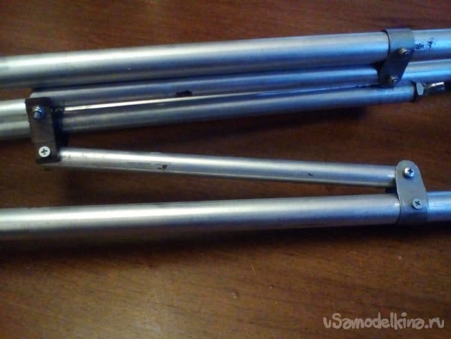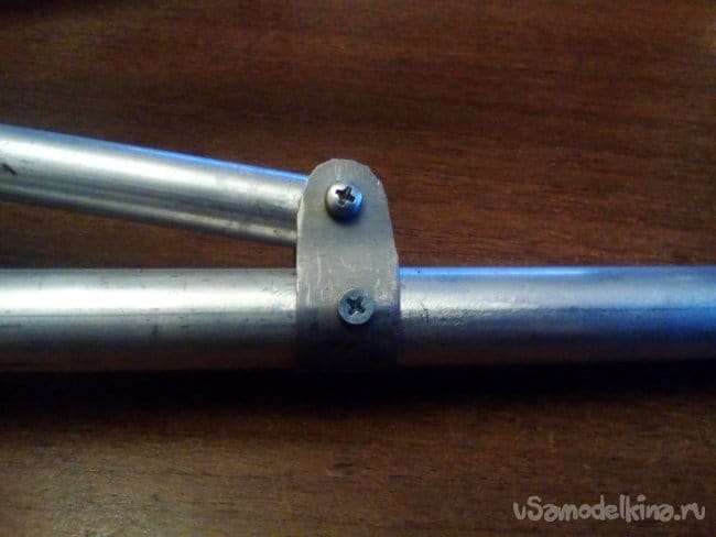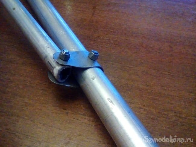 После этого просверлил в нужных местах отверстия для креплений петель и под винты. Петли сделал из полосок нержавеющей стали, закруглив их по краям. Обернул их вокруг трубок, разметил и просверлил отверстия для фиксации на толстых трубках и под оси для тонких. Прикрутил их на место. Вставил и закрепил в них тонкие распорные трубки.