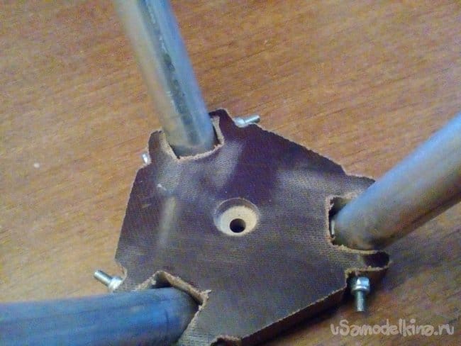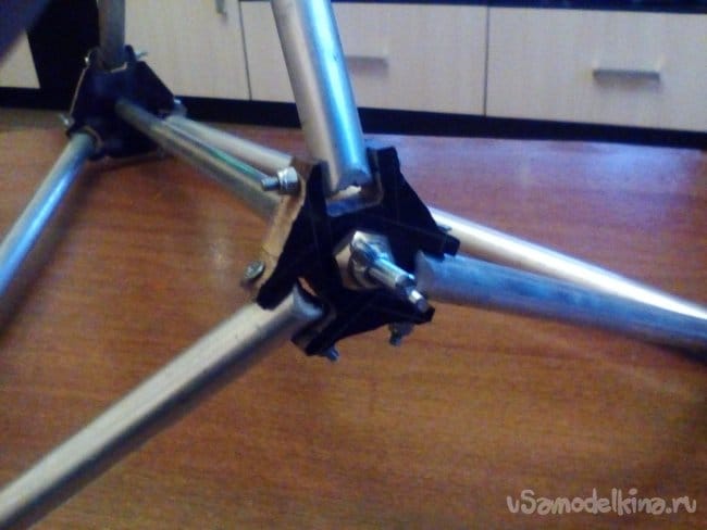 Напильником скруглил торцы трубок, чтобы при вращении они не цеплялись за шайбы. Расстояние крепления распорных трубок и центральной трубки одинаковы и составляют 400мм. При расхождении ножек шарнир оказывается выше малой шайбы, что обеспечивает ее провисание и невозможность самопроизвольного складывания. Далее отпилил 450мм резьбовой шпильки.