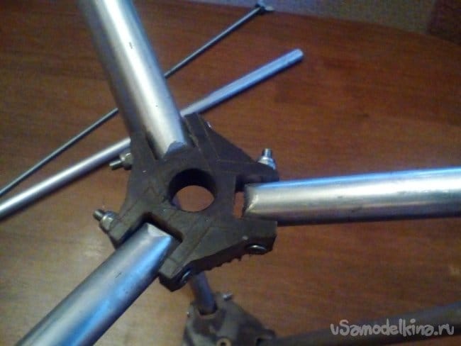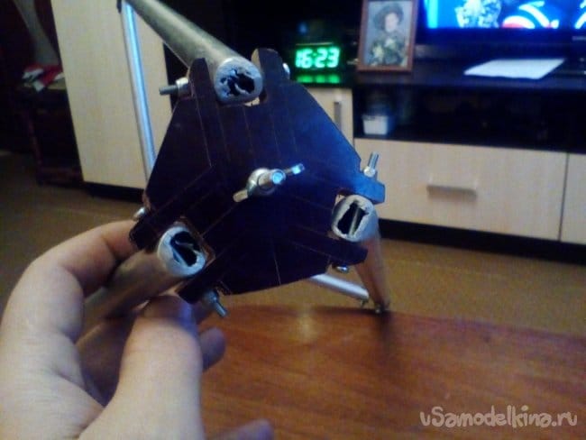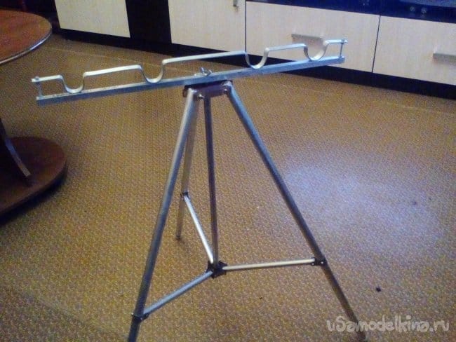 Она крепит центральную трубку к верхней шайбе и верхний ее конец служит осью для крепления ложементов для удилищ. Скручиваем все в единое целое. Проверяем работоспособность.