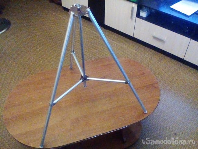 По центру квадрата сверлим отверстие под шпильку. Осталось прикрутить барашковой гайкой ложемент к стойке, развести ножки и стойка готова к службе!