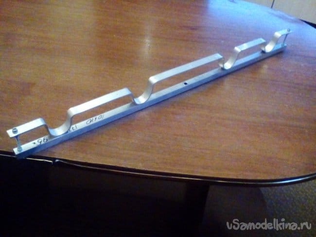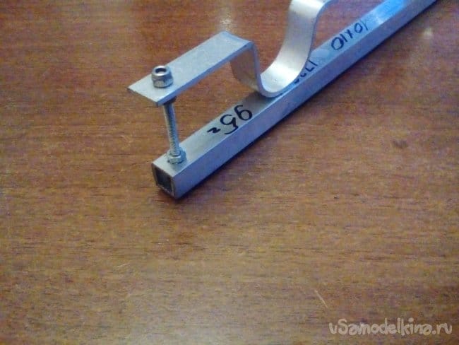 Из алюминиевого квадратного профиля отрезаем 500мм кусок. по краям сверлим отверстия под крепеж ложемента. Сам ложемент изготавливаем из алюминиевой полосы, изгибая так, чтобы получились желоба, куда будет ложиться фидер. Так же сверлим на концах отверстия и соединяем с квадратным профилем так, как показано на фото.