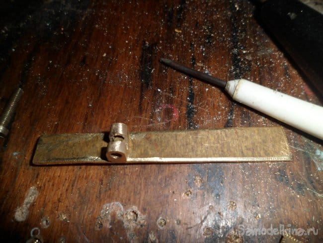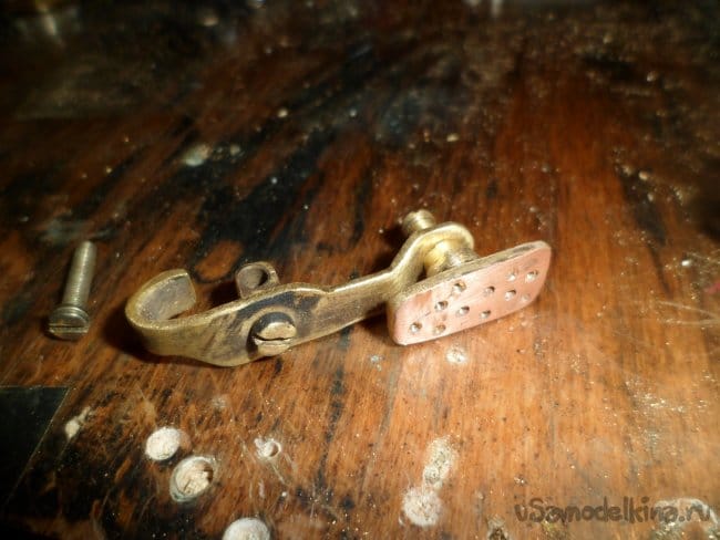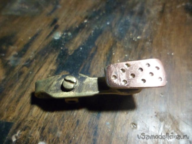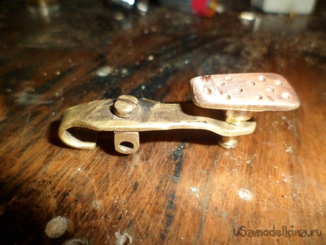 После спаял все детали и начал делать кнопку для включения сигареты . Чтоб не отходить от темы "хот рода" кнопку решил сделать в виде педали газа которая на мой взгляд идеально впишется в дизайн моей самоделки. Подвижный механизм ( мини навесик ) я изготовил из детали от советской контактной группы , которую распилил пополам и надфилем выточил нужные пазы для соединения их друг с другом.