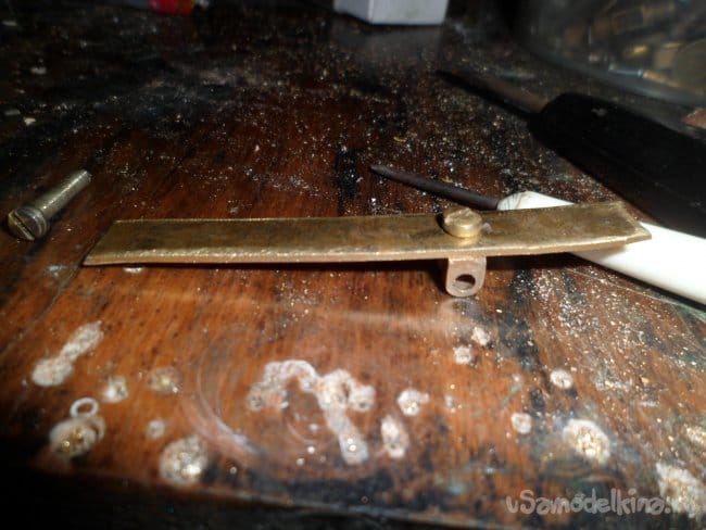 Рычаг педали изготовил из листовой латуни к которой припаял часть навеса и сделал отверстия под болт для точного нажатия педаль на кнопку на который собственно и прикрепил накладку педали газа и как в анекдоте " тщательно обработал напильником " для придания подходящей формы .