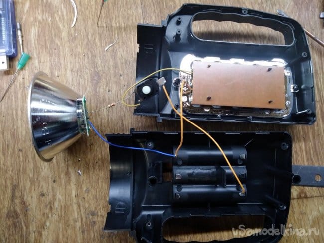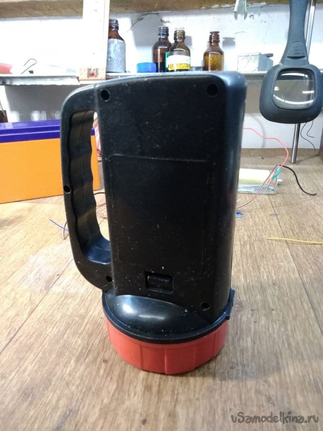 В задней стенке корпуса фонаря пришлось сделать отверстие для разъёма зарядки. Зарядное используется от любого тлф., имеющего микро USB разъём.