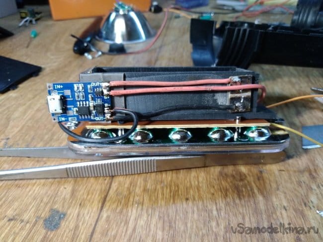 Бокс приклеил при помощи двухстороннего скотча к панели боковых светодиодов. К одной стенке бокса приклеил, опять таки на двухсторонний скотч, панель контроля заряда-разряда, на которой смонтирован микро USB разъём, для зарядки аккумулятора, не вынимая его из бокса.