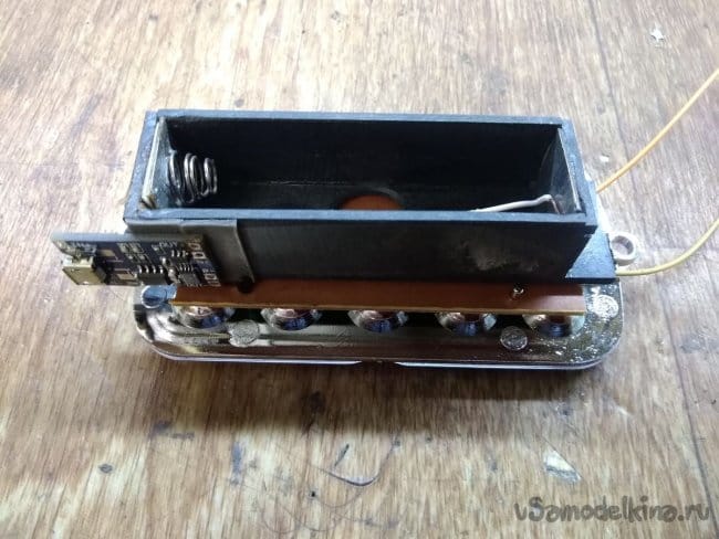 Из остатков корпуса кассетного магнитофона склеил, при помощи секундного клея, бокс для аккумулятора 18650. В торцах бокса приклеил контактные площадки (минусовая с конической пружиной от какого-то батарейного отсека, плюсовая - просто кусочек луженой жести)