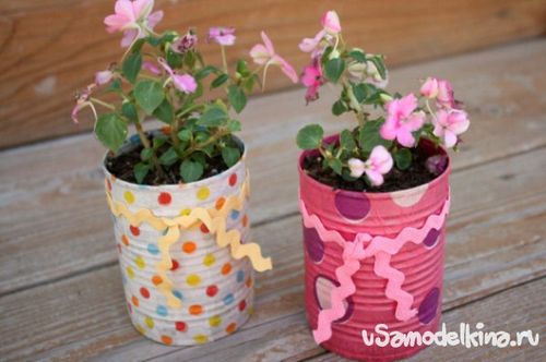 Чтобы сделать красивый горшок для цветов из жестяной банки Вам потребуется лист красивой бумаги, клей и ножницы. Консервную банку необходимо предварительно тщательно помыть и высушить. На жестяные стенки следует нанести тонкий слой клея ПВА. Он нужен для фиксации листа бумаги на поверхности банки. Из листа бумаги вырезается прямоугольник, который по свом размерам совпадает с поверхностью банки. Бумажная заготовка заворачивается вокруг жестяной основы. Готовое изделие можно украсить ленточками и дополнительными украшениями.