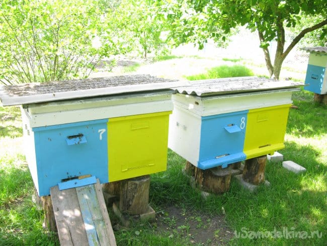 Показаны простые подставки для ульев, а именно колоды, которые устанавливаются на кирпичи.