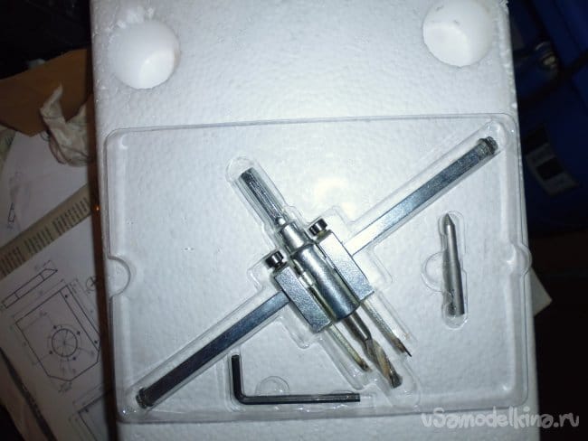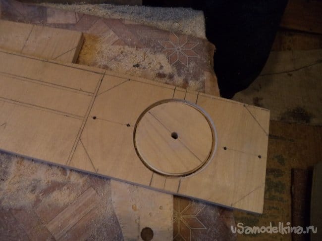 2. Просверлить отверстия диаметром 8 мм в центре ложе вентилятора, затем установить Балеринку на дрель и вырезать, до середины фанеры радиус под ложе вентилятора, затем перевернуть фанеру и дорезать радиус до конца.