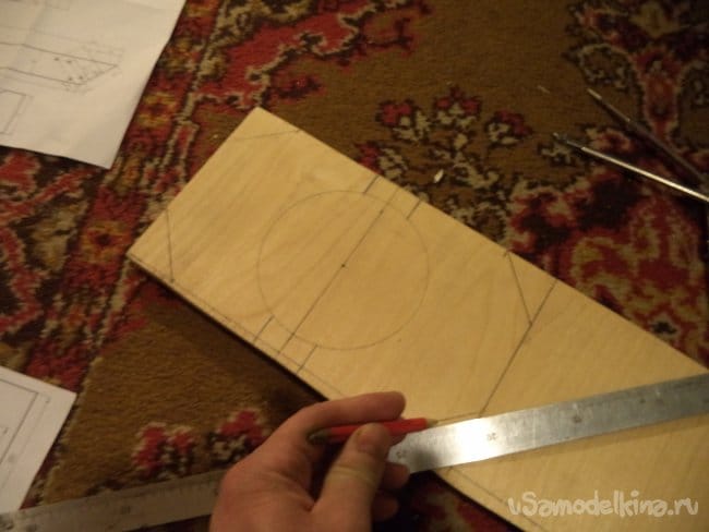 1. На фанере размечают заготовки стойки, ребра, два ложе вентилятора расположенные таким образом, чтобы диаметр был для них общим.