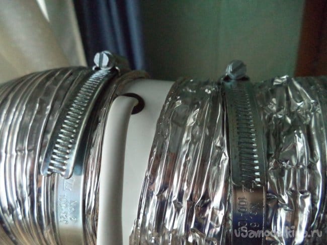 9. Один из концов короткого отводящего патрубка натягиваем со стороны выхода на стальной корпус вентилятора для вытяжки и закрепляем червячным хомутом.
