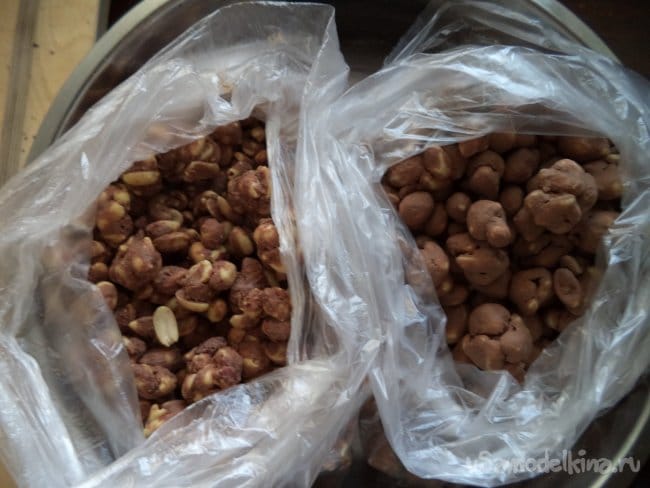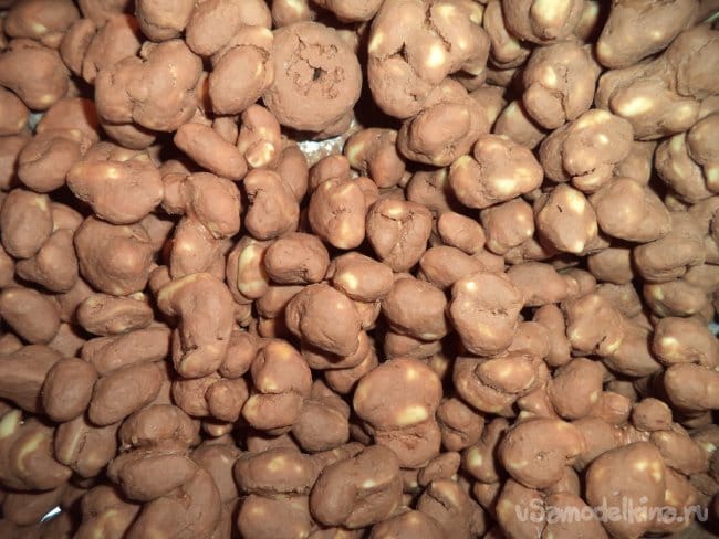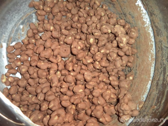 Засыпаю арахис, заливаю расплавленным шоколадом, шоколад быстро сохнет, образуя вокруг орехов равномерную шоколадную корочку круглой формы.
