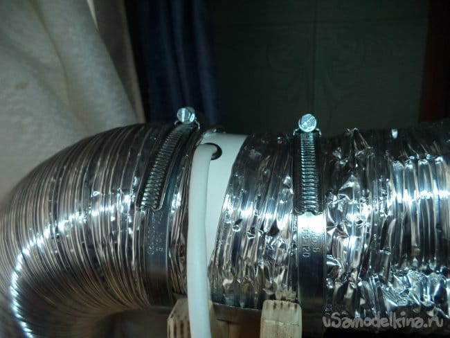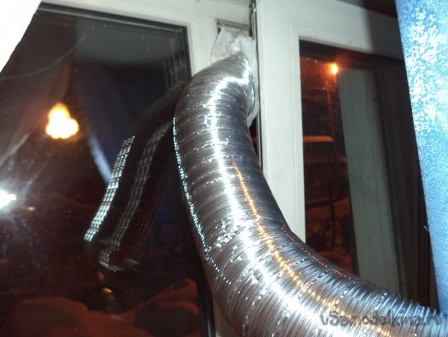 8. Конец подводящего патрубка с фильтром выставляем на улицу в приоткрытое окно или форточку и закрепляем стальной проволокой.
