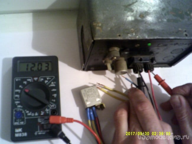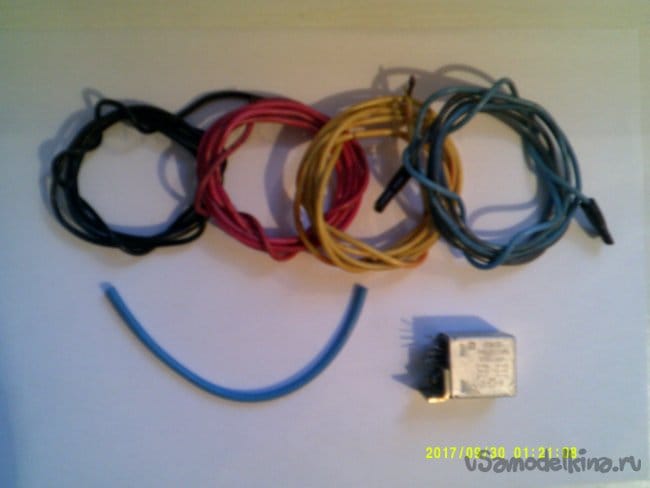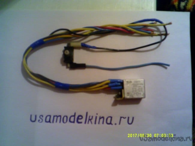 Одеваем кембрики на выводы реле, чтобы они не замкнули друг с другом. Жгут проводов стягиваем изолентой в двух местах. К выключателю В1 подключаем провода с клеммами «мама», самоделка готова.