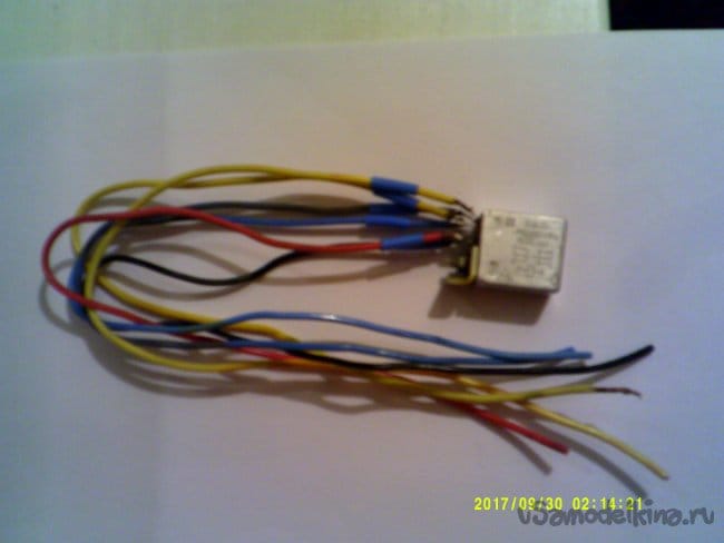 - Припаиваем провода длинной 35см , красный к выводу 7 реле-это будет питание +12в, черный провод к выводу 8,это будет -12в.Далее паяем желтые провода к 1 и 3, а синие – к 4 и 6 выводам реле.