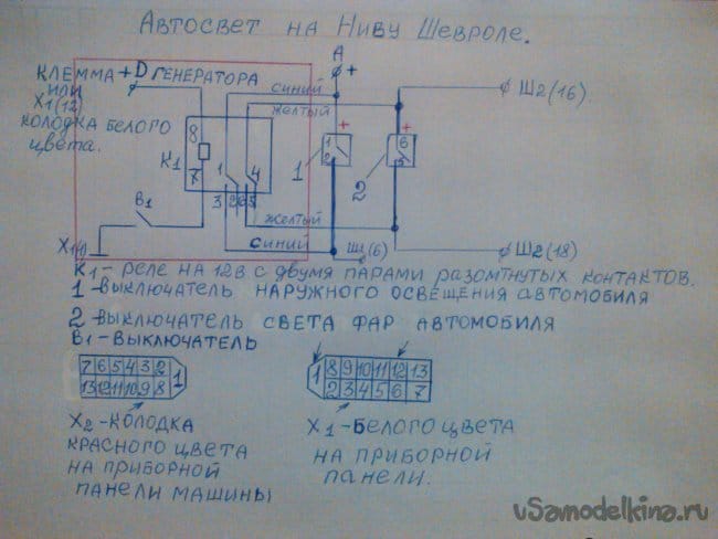 Шаг 4. Подключаем ее на автомобиль. Для этого красный провод самоделки подключаем к проводу, подходящему выводу 12 колодки белого цвета на приборной панели Нивы-шевроле. А черный провод подсоединяем к выключателю В1, а второй провод выключателя подсоединяем на корпус авто. Желтые провода – к выводам 5 и 6 выключателя света фар автомобиля.Синие провода – к выводам 1 и 2 выключателя наружного освещения авто. Самоделку прикрепляем автомобильной стяжкой к жгуту проводов в удобном для нас месте возле приборной панели, а выключатель В1 - на месте любой заглушки выключателей, которые не установлены на автомобиле. Эта самоделка установлена на машину 8.01.2017 года и работает без нареканий. Выключатель В1 нужен для отключения схемы при длительных прогревах автомобиля на стоянке. При отказе схемы, отключаем ее выключателем В1 и включаем свет авто как обычно, ведь схема автомобиля не изменена.