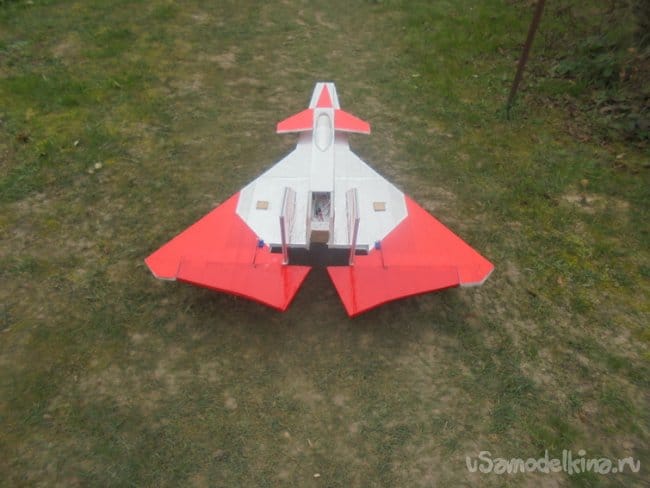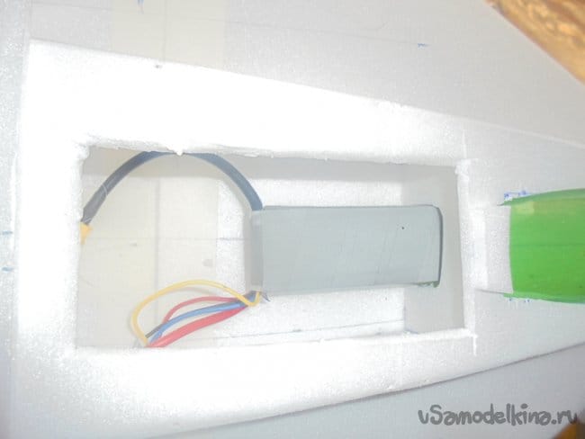 Аккумулятор и вся электроника находится в фюзеляже. Доступ к ним происходит через специальный люк, который фиксируется при запуске модели прозрачным скотчем.