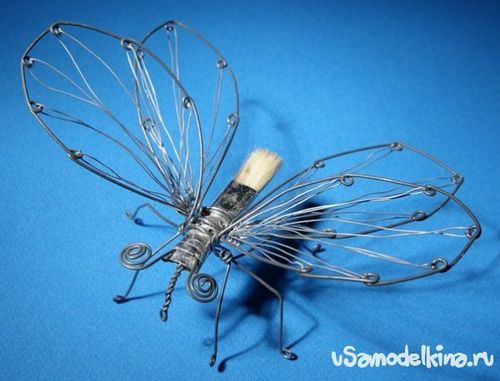 Также металлические изделия можно комбинировать между собой для создания более интересных и оригинальных поделок. Насекомое, выполненное своими руками, из проволоки и скрепок – яркое тому подтверждение. Только кроме вышеперечисленного материала для туловища будущей поделки потребуется еще одна кисточка. Все части насекомого собираются отдельно – четыре крыла, два глаза, нос и ноги. Каркас крыльев выполняется из проволоки, а середина – из скрепок. Нос и ноги поделки изготавливаются из более прочного материала – проволоки. На ручку кисточки одевается цилиндрический кожух ( это может быть любая ненужная деталь или запчасть от чего-нибудь), который сплющивается у основания. Соединение всех частей выполняется при помощи связывания скрепок и проволоки друг с другом. Немного фантазии и терпения и у Вас в руках уже новый вид насекомого.