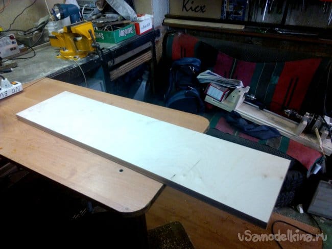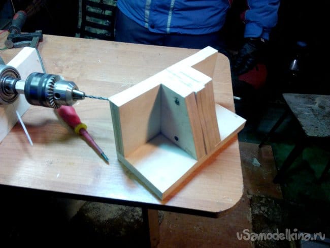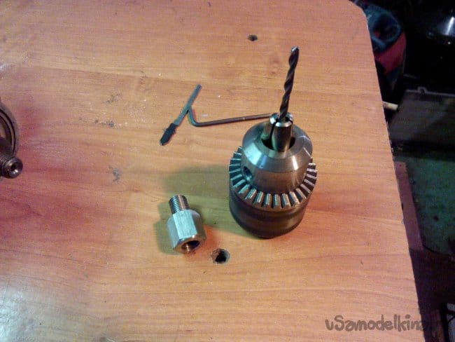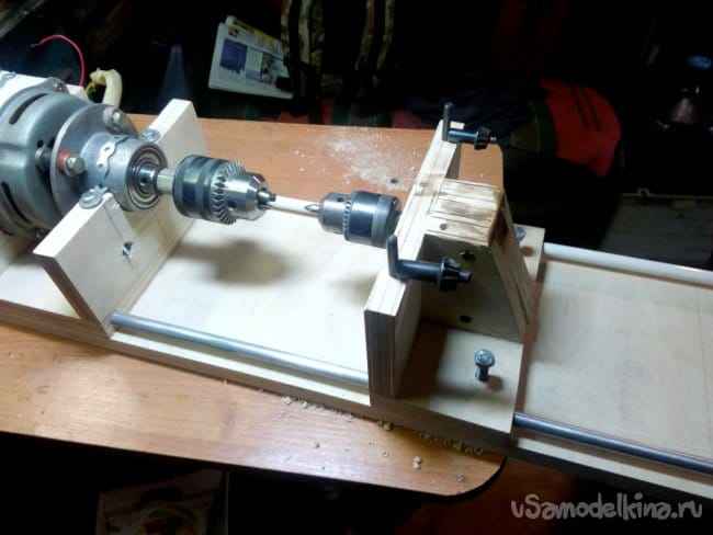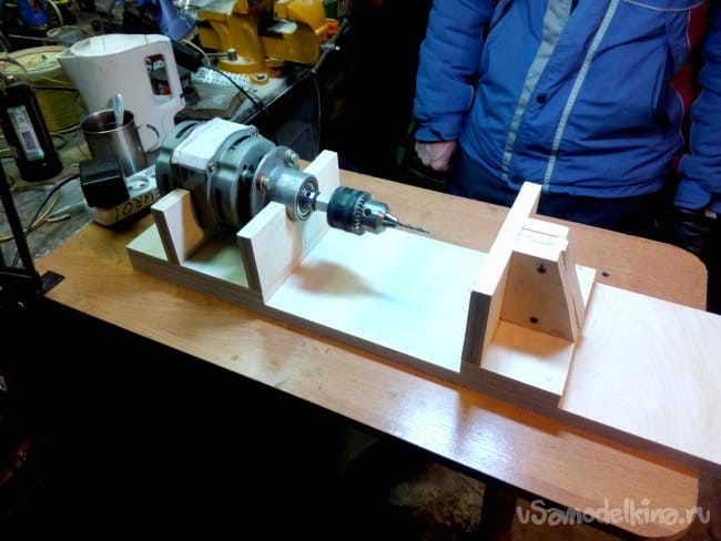 Сразу же в голове нарисовался станок, начал думать как закрепить двигатель. За один вечер сделал крепление двигателя, основание и подвижную бабку. Проблема встала с направляющими, на неделе купил две трубки в мебельном, и на работе уже сделал переходник для патрона. Дальше закрепил направляющие, и долго размечался с отверстиями в подвижной бабке. Вроде всё получилось. Есть в этом станке много недочётов, был бы железный, проблем бы не было наверно. Направляющие очень слабенькие, прогибаются.