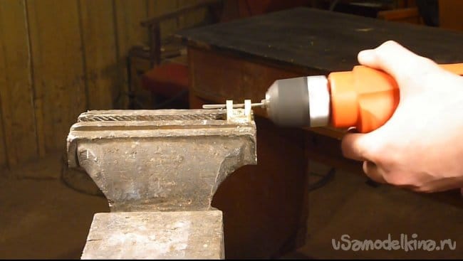 Далее сверлим отверстия под шпильку и отгибаем одну сторону ручки.