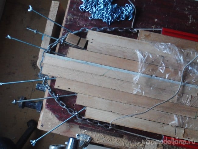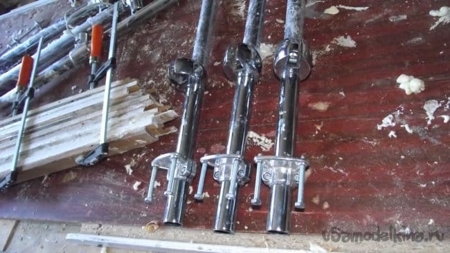 Распилив ножовкой трубу на 4 части по 75 см так как нужно четное количество отрезков, что однако дает мне возможность клеить шиты до 60 см. Я стал экспериментировать (об этом я рассказываю в видео). Цепь дает усилие на стягивания ламелей, но она имеет много степеней свободы по этому в начале нужна сноровка, а что бы шпилька стремилась уйти в сторону я позже стал использовать брусок с отверстиями, которые нивелировал всю подвижность цепи. Да конструкция более подвижная чем заводские варианты, за то тут полностью отсутствует закусывание подвижных деталей, а так же фиксирующий элементы зажимаются болтом, что в свое очередь исключает износ фиксирующих зажимах как на дорогих покупных струбцинах.