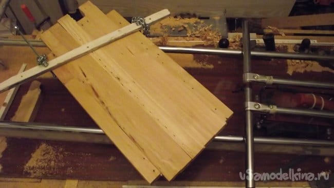 Со временем накопилось много разносортных обрезков и просто досок. И пришла в голову мысль склеить их в мебельные шиты.