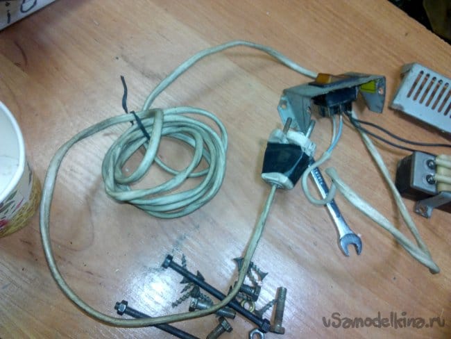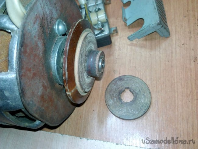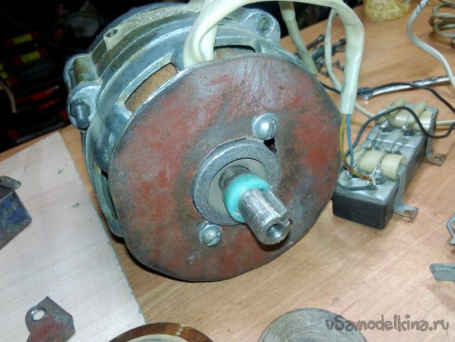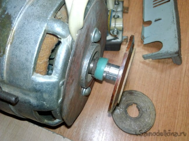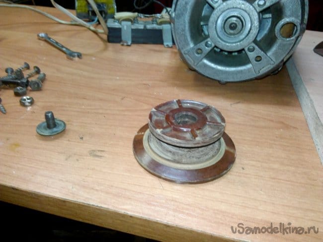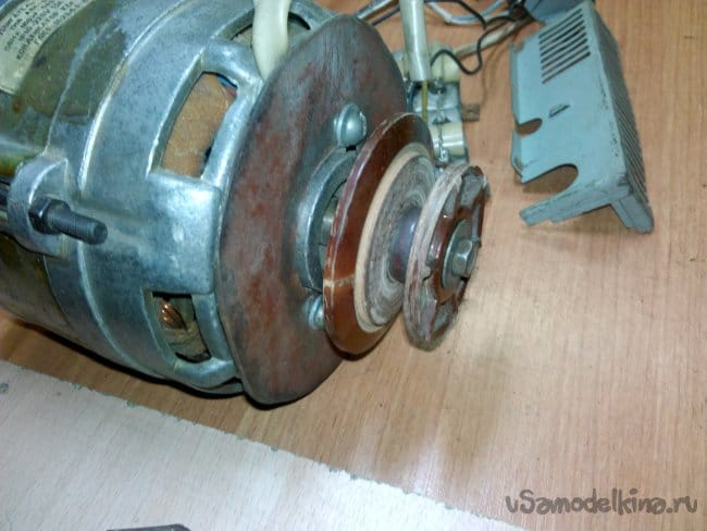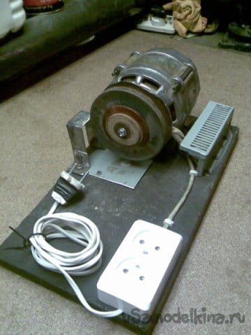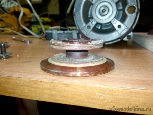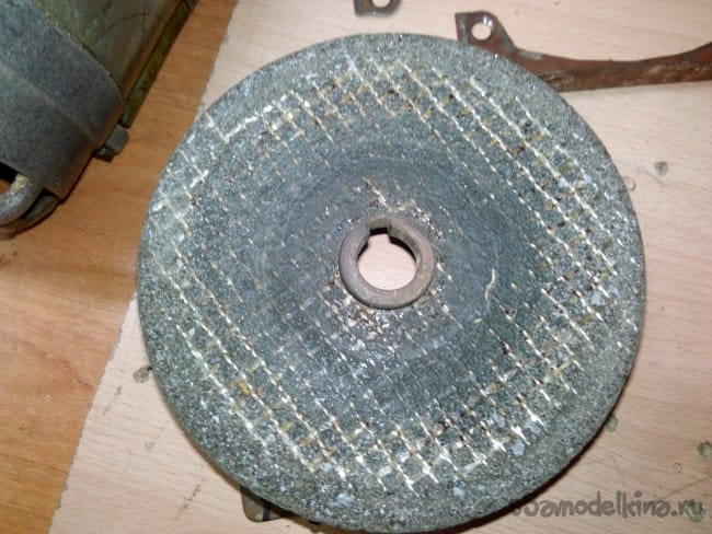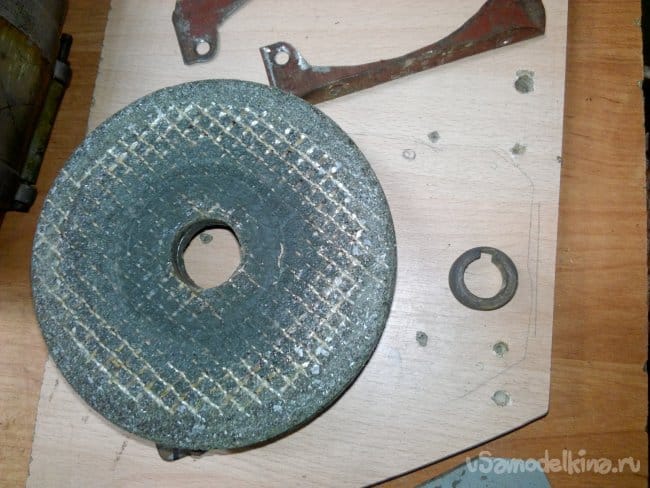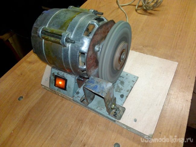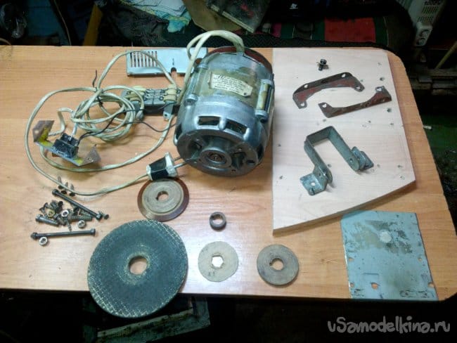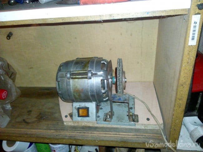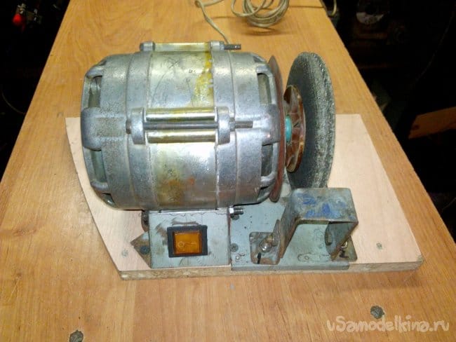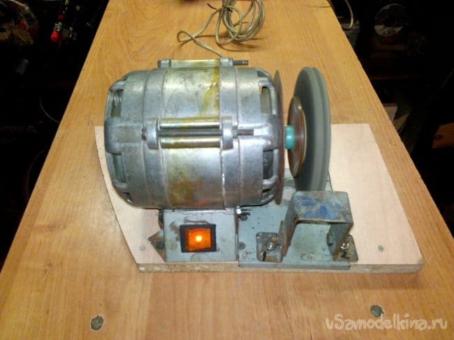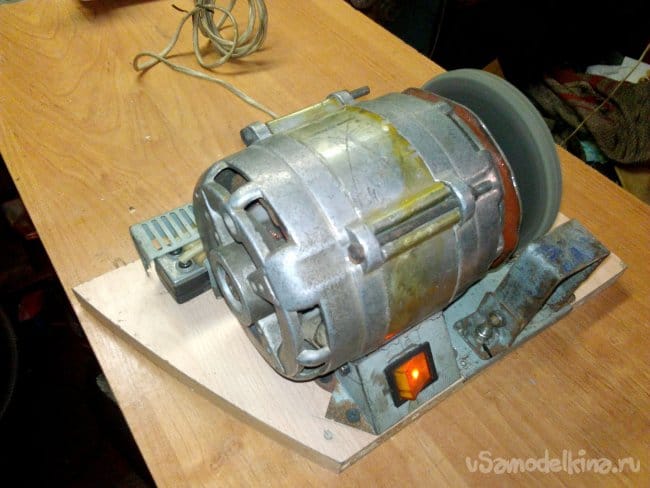 Собран на движке от старой стиральной машины типа "Вятка". Долго этот движок валялся в гараже, и наконец то дошли до него руки. Собрали за два вечера, первый вечер ушёл на крепление движка к основанию, подборке кондёров и поискам схемы подключения в нэте по мобиле. За второй вечер выточили планшайбы и втулку для крепления абразивного диска на валу, установке выключателя и дополнительной розетке.