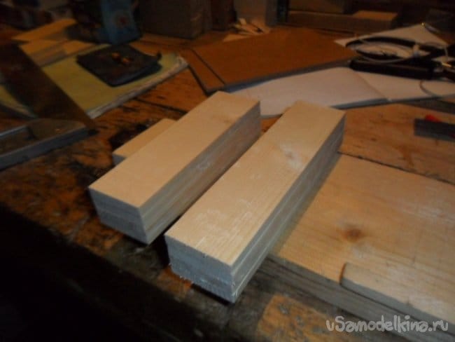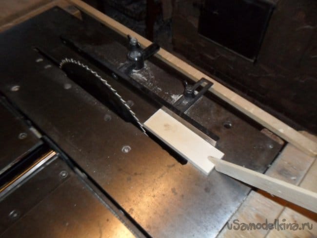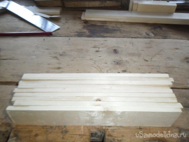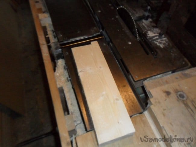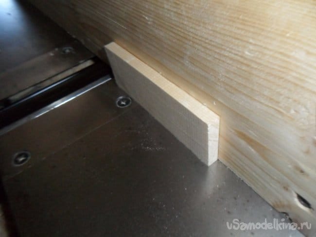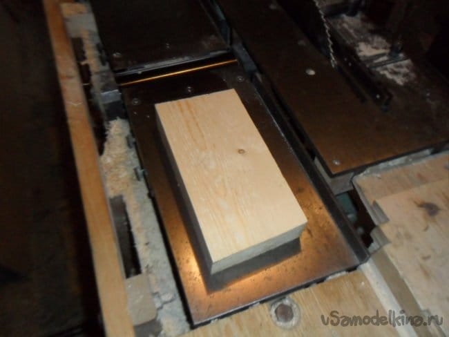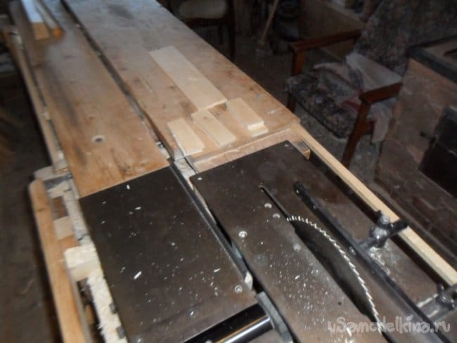 Две заготовки бруса длиной 30 см и 40 см фугуем со всех сторон и распиливаем на станке. Толщина заготовок получилась равной примерно 8 мм.
