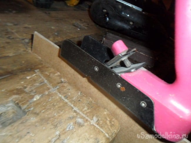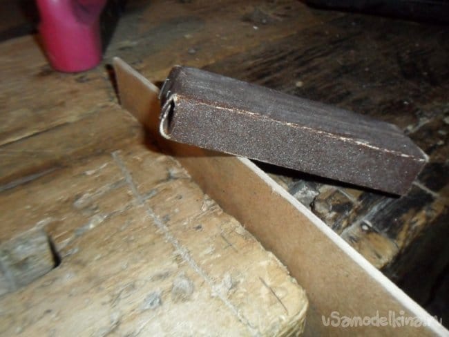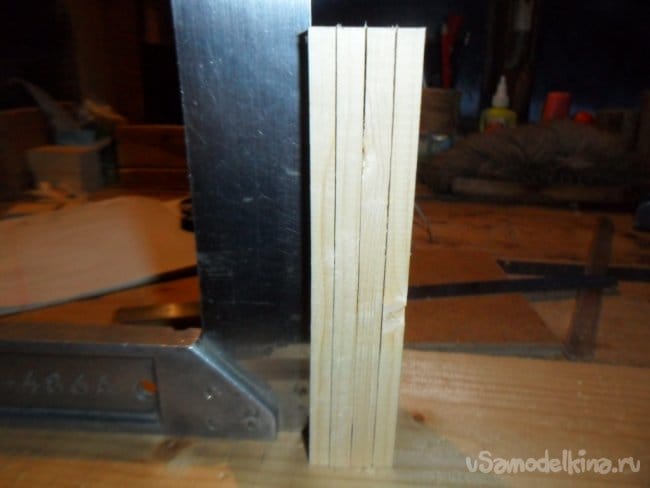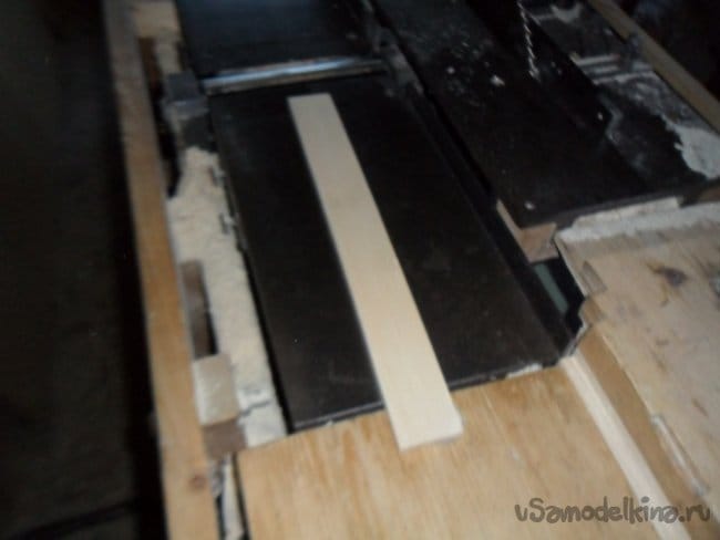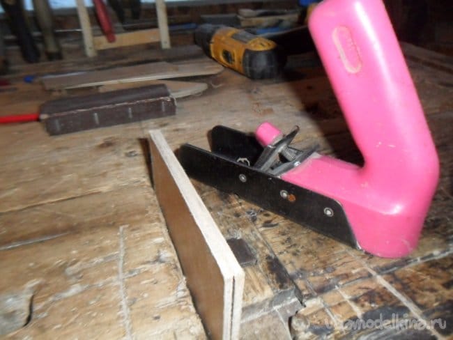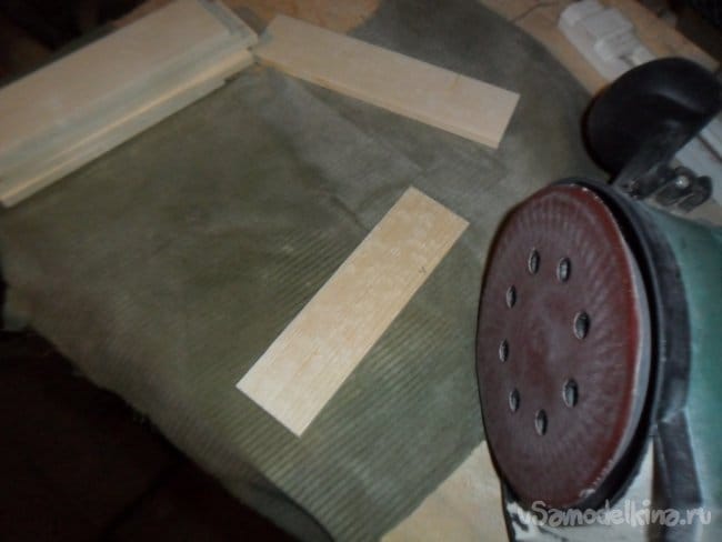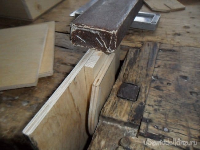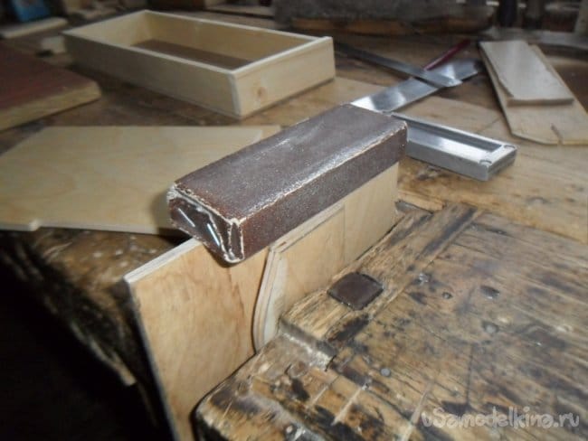Все детали готовы и точны, за исключением одной перегородки. Ее длину нужно уменьшить примерно на 1 мм. Делаем это при помощи бруска, обтянутого плотно наждачной бумагой, зажав перегородку и небольшой кусок фанеры так, чтобы их торцы лежали в одной плоскости.