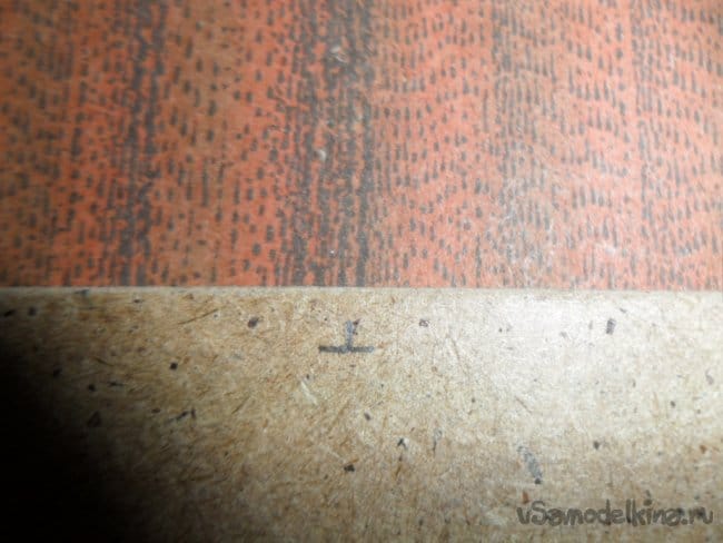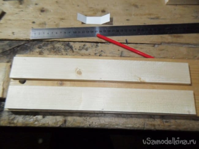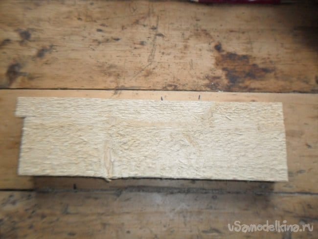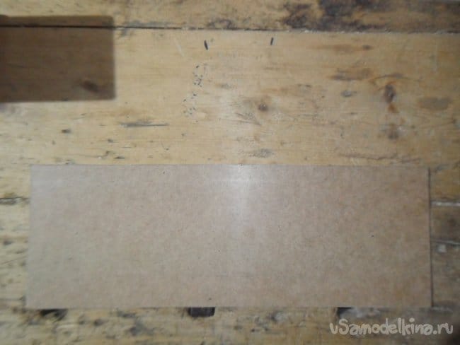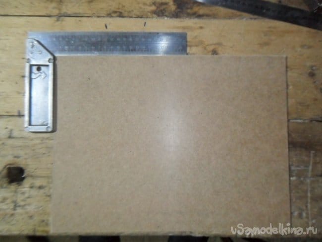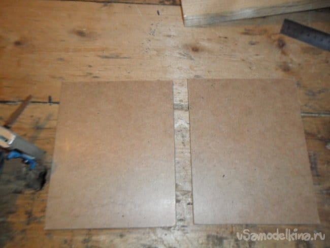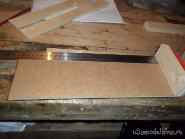 Изготавливать сначала будем длинный ящичек с четырьмя отделениями. В стусле отпиливаем фронтальную и заднюю стенки будущего ящика. Далее приставляем их вплотную друг к другу и располагаем вровень с краем листа из ДВП. Измеряем линейкой оставшуюся свободную часть и переносим размер на длинные рейки. Отпиливаем их торцы. Также нужно отпилить заготовки для внутренних перегородок ящика. Так как их много (3 шт.), то рекомендуется в стусле закрепить какой-либо упор, который поспособствует более точному и быстрому пилению.