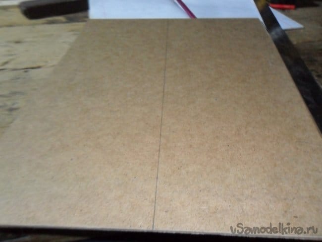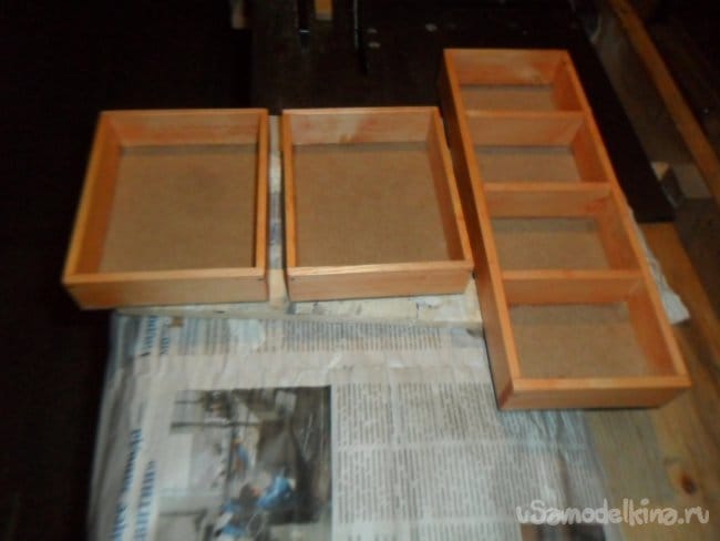 Из большого листа ДВП лобзиком отпиливаем часть, площадь которой будет не менее суммы площадей днищ ящиков. В данном случае S = 37 х 28 = 1036 кв. см. Затем рубанком доводим лист до прямоугольной формы. Подшкуриваем. Размечаем границы трех частей. По прочерченным линиям проходим лобзиком. Неровные края также обрабатываем рубанком и наждачной бумагой.