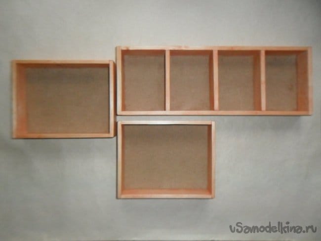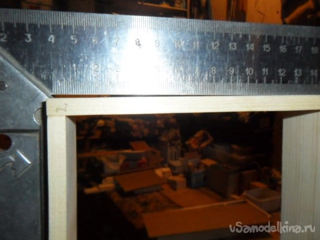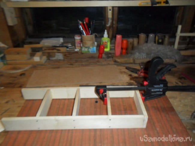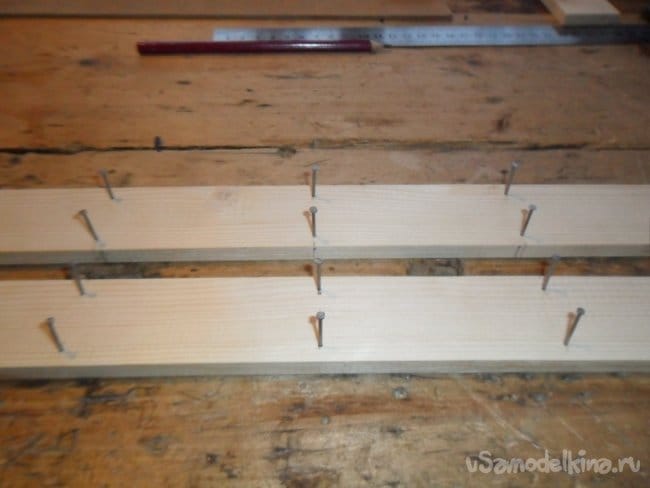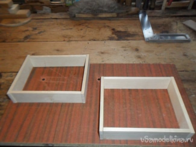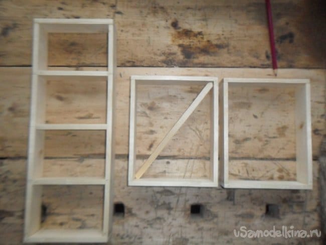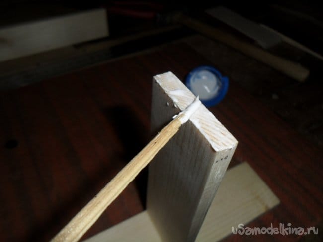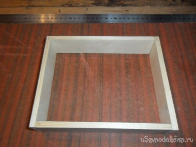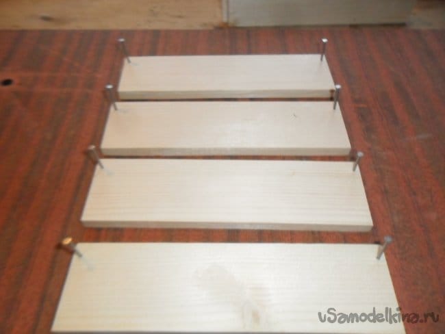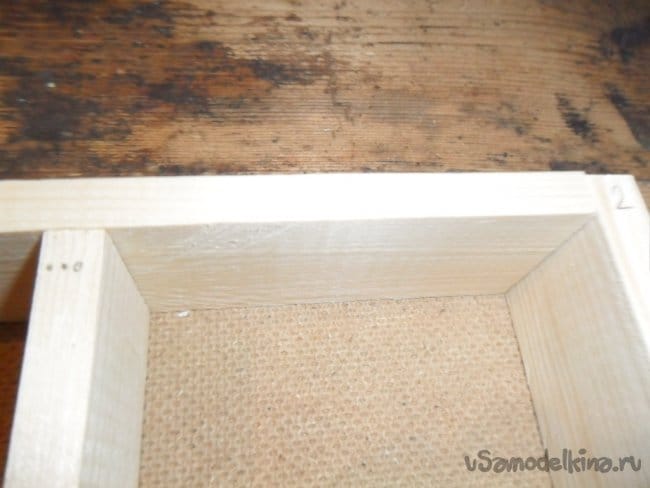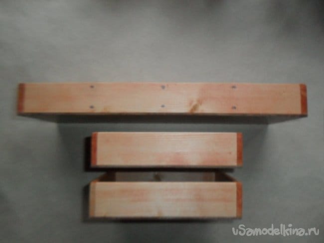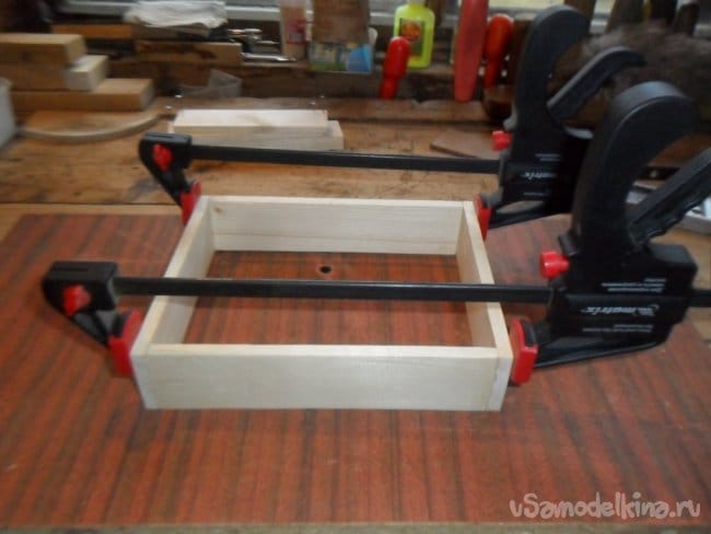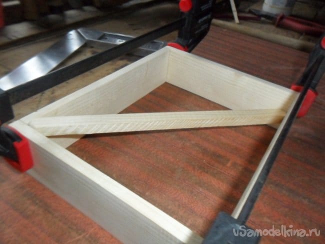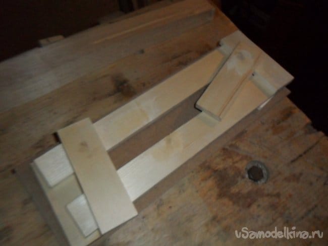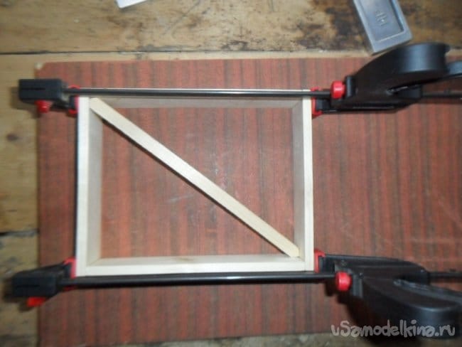По такому же принципу сколачиваем оставшиеся два простых ящика. Но есть одна загвоздка: боковины ящиков уводит в ту или иную сторону, и в результате может получиться коробка не прямоугольная, а параллелограммная. Чтобы предотвратить такую ситуацию, следует ящики при схватывании клея жестко зафиксировать, добившись прямых углов. Для этого вставляем в направлении меньшей диагонали рейку с подкругленными торцами так, чтобы она немного растянула ящик до прямоугольной формы.