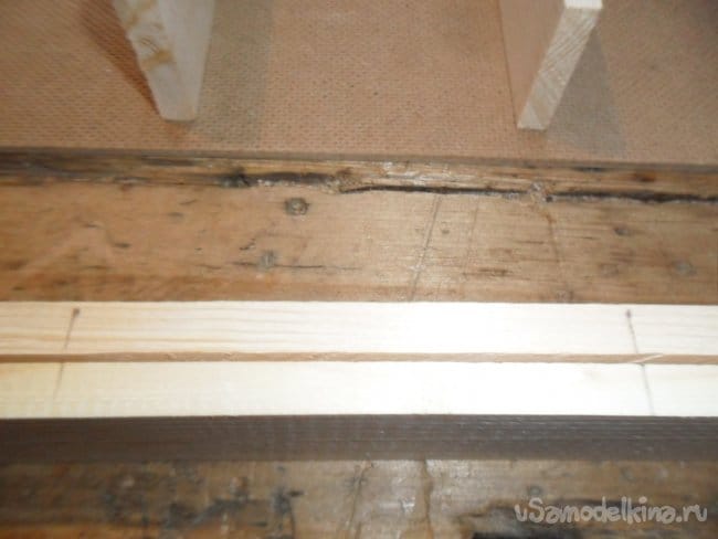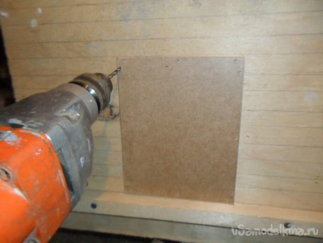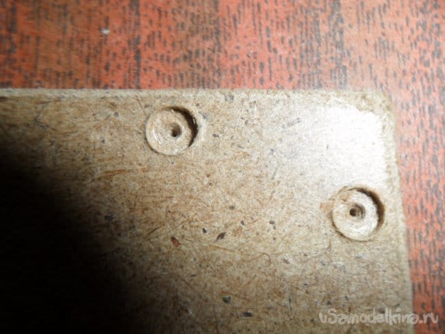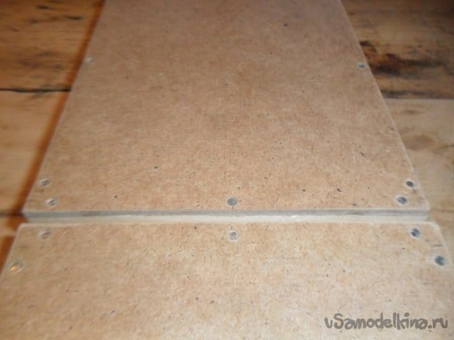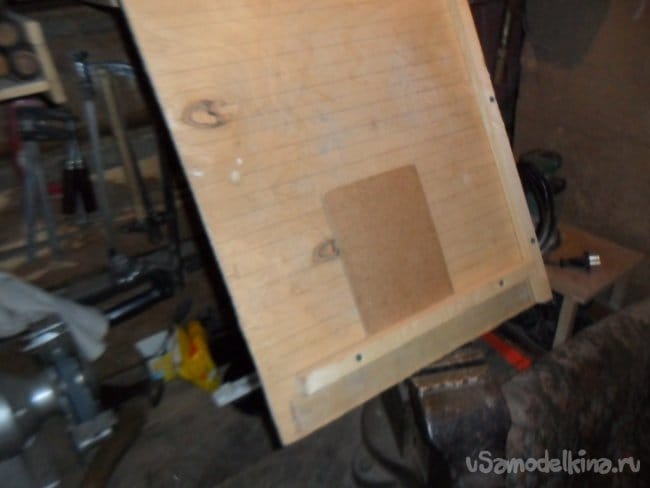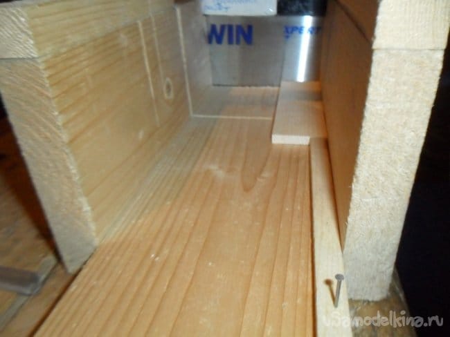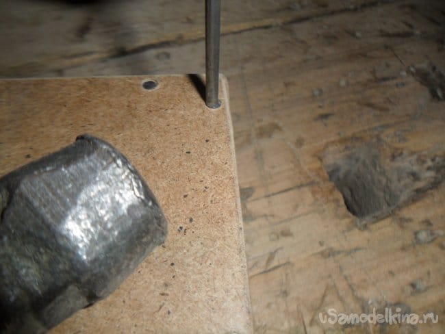 Вбитые обычным способом гвозди царапают поверхность, по которой передвигают ящики. Чтобы избежать таких последствий, гвозди рекомендуется заколотить чуть глубже. Для этого надсверливаем аккуратно сверлом (d=3мм) углубления в 1-1,5 мм. Чтобы сверлилось удобно в стоячем положении, используем лист фанеры.