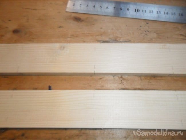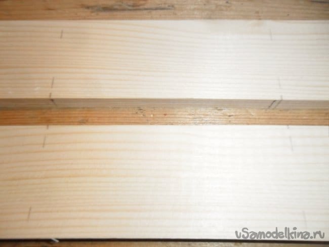 Настало время соединить прочно все составляющие ящиков. Начнем с длинного четырехсекционного. Размечаем на длинных рейках места, напротив которых будут располагаться перегородки: центральная – точно посередине стенки, а две крайние – посередине расстояния между торцом рейки и правой и левой боковыми сторонами центральной перегородки. В итоге получится четыре одинаковых отделения. Проводим отмеченные линии перпендикулярно на внешние стороны стенки и отмечаем точками места, куда будут вбиваться гвозди.