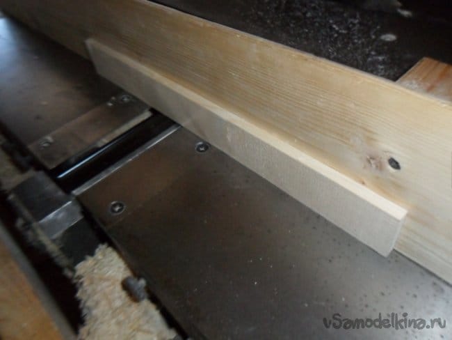 Стенки и перегородки для длинного ящика следует привести к одной ширине, чтобы у него был эстетичный вид, и при надобности можно было плотно накрыть ящик крышкой или иной плоскостью. Для этого пропускаем деревянные рейки через распиловочный диск и ножи фуговального вала станка.
