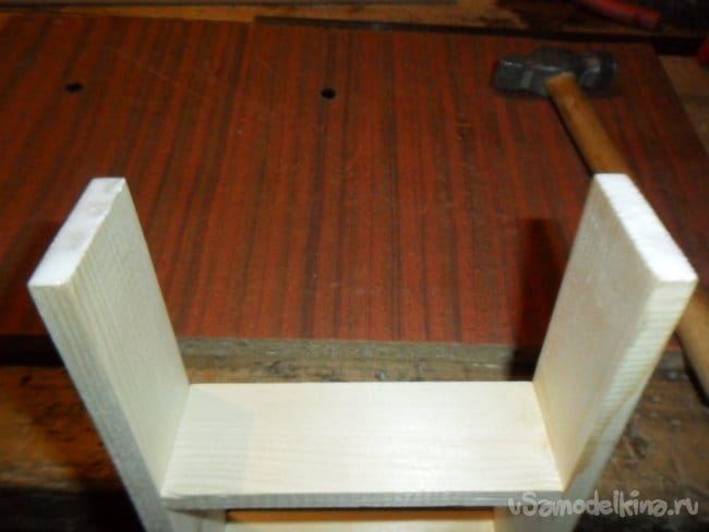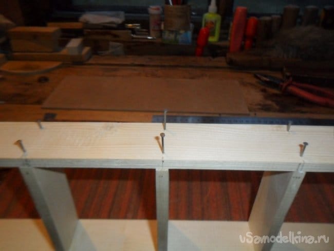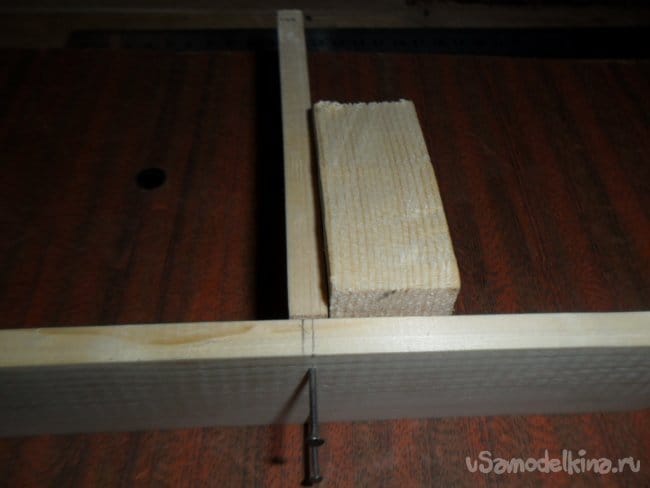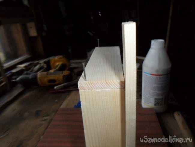 Вколачиваем гвозди длиной 25 мм в отмеченные места обеих реек так, чтобы они (гвозди) не выходили за противоположную грань. Далее берем перегородки и смазываем их торцы столярным клеем. После этого точно прикладываем их в нужные места длинной стенки и вбиваем гвозди. Затем переворачиваем конструкцию и проделываем ту же операцию, но уже с другой подготовленной стенкой. Осталось присоединить переднюю и заднюю стенки ящика: на каждой будет по одному гвоздю вверху справа и слева; торцы ранее скрепленной конструкции также смазываем клеем. Нижние части короткой стенки и одной из перегородок для плотного соединения стягиваем струбциной.