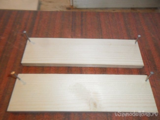 Столярным клеем смазываем по краям внутреннюю поверхность днищ и, положив их на деревянную скрепленную основу, забиваем гвозди. Затем другим гвоздем (без острия) добиваем их, чтобы плотнее «сидели».