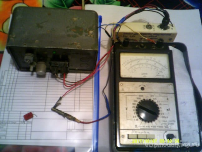 Замкнув после этого гнезда убеждаются в отклонении стрелки за конечное деление. Я уменьшил C2 -20 пф, R1-1 ком , C1 – 3300 пф теперь прибор проверяет конденсаторы от 1 пф. Как подключать прибор к Ц4315 показано на фото. Этот прибор работает у меня уже 5 лет , им легко и быстро проверять конденсаторы.