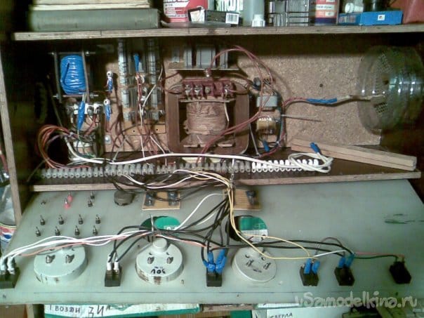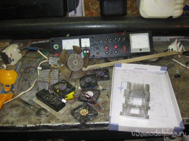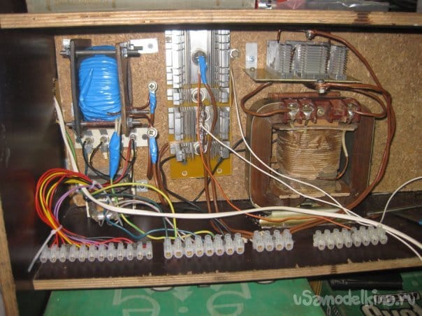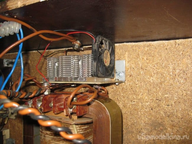 Регулировка производится потенциометром типа ППБ-15, который открывает тиристор. Диодный мост собран на компьютерных радиаторах, так же применён вентилятор для охлаждения.