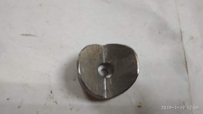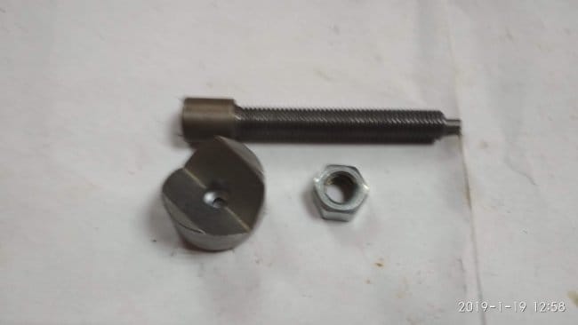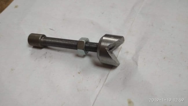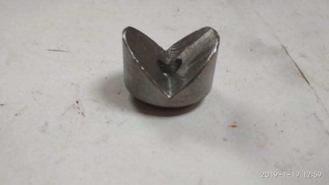 Потом был выточен винт прижима с резьбой М12 и изготовлена прижимная губка. Сначала был выточена цилиндрическая заготовка с отверстием, а потом срезана углом часть, так, чтобы получилась угловая губка. Ей будет удобно прижимать и профтрубы и заготовки круглого сечения.