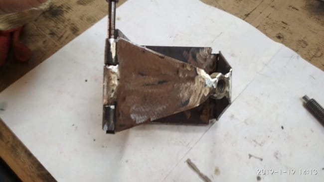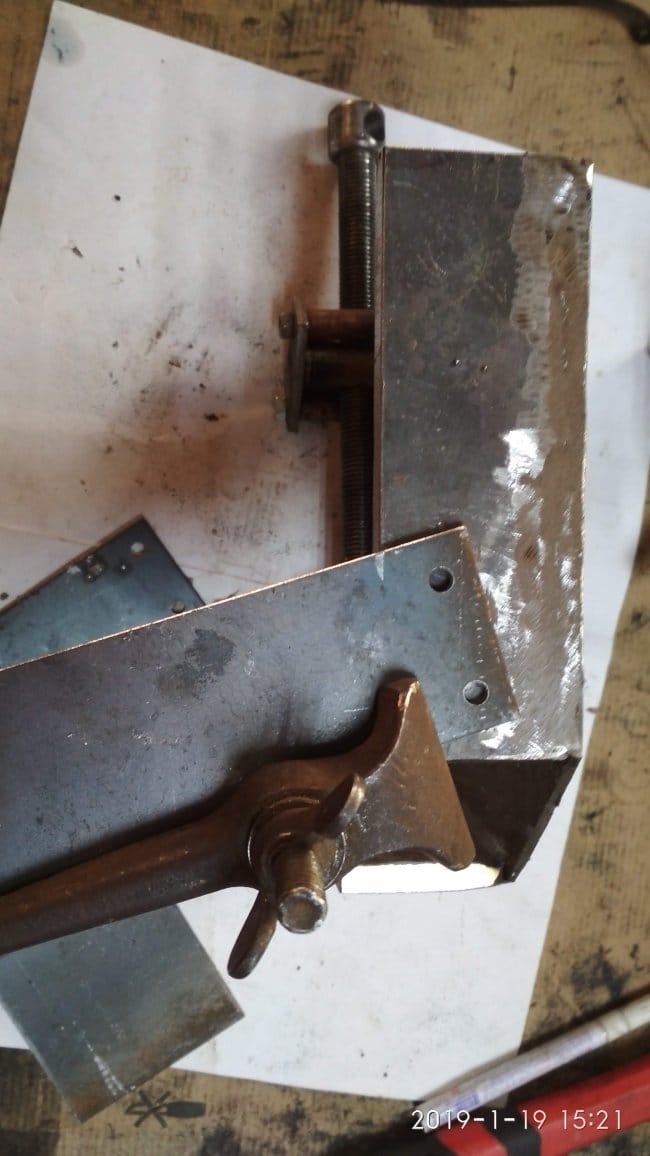 Приварил и подогнул все по месту. Получилось все как задумал. Вкрутил винт, одел прижимную губку и расклепал с внутренней стороны, чтобы не спадала. В данном узле подвижность в других плоскостях не нужна, нужен лишь прижим.