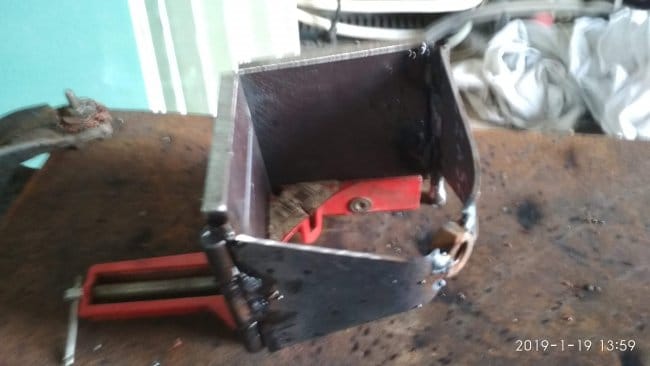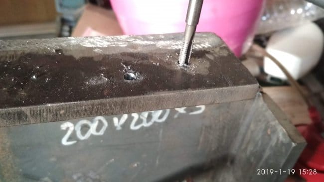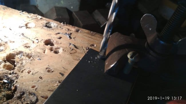 Примеряю как она будет стоять на струбцине и размечаю отверстия для нарезания резьбы М6 по два на каждый кронштейн.