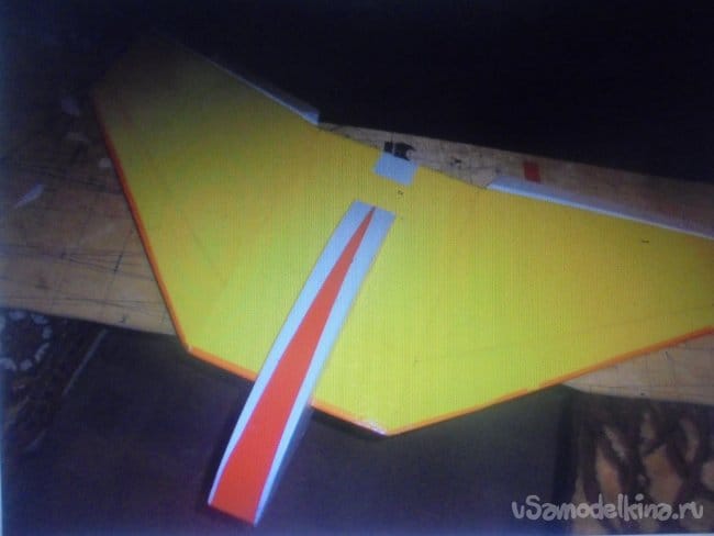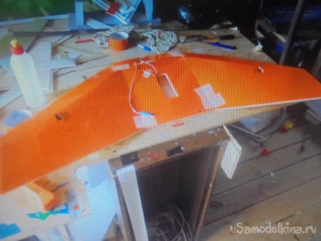 Крыло склеено, сервомашинки установлены, начинаю обтягивать цветным скотчем.