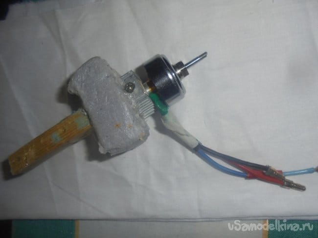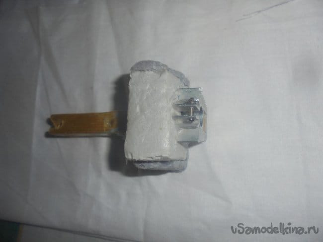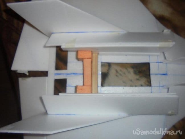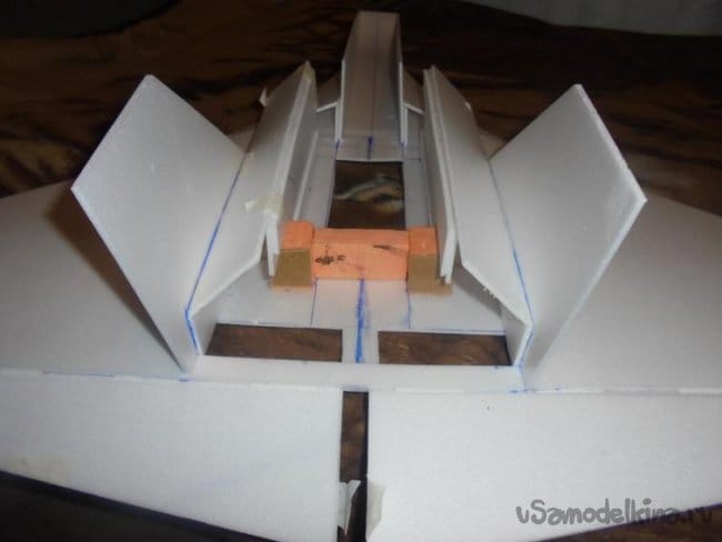 Для крепления моторов вклеил кусочки утеплителя «пеноплекс», на которые приклеил фанерки размером 40 х40 мм. К ним будут приворачиваться моторы.