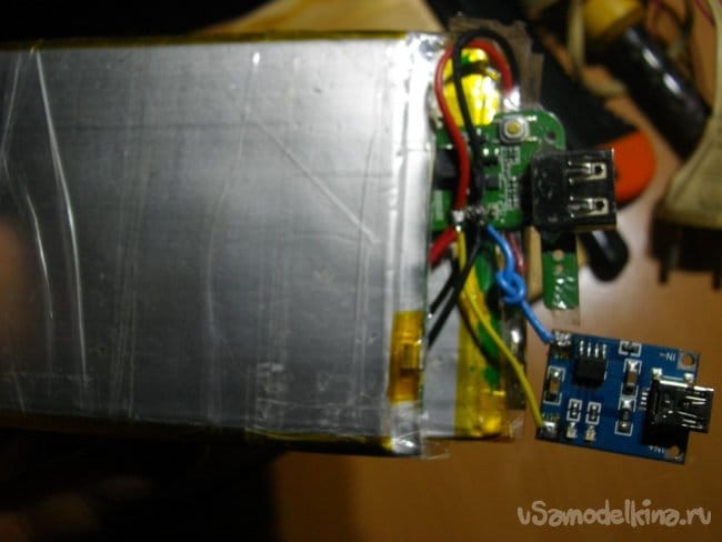 Для заряда батарей использовал стандартный модуль заряда литиевых батарей, а модуль для повышения напряжения нашёл в одном из поломанных планшетов , на нём даже была индикация включения нагрузки в виде светодиода.